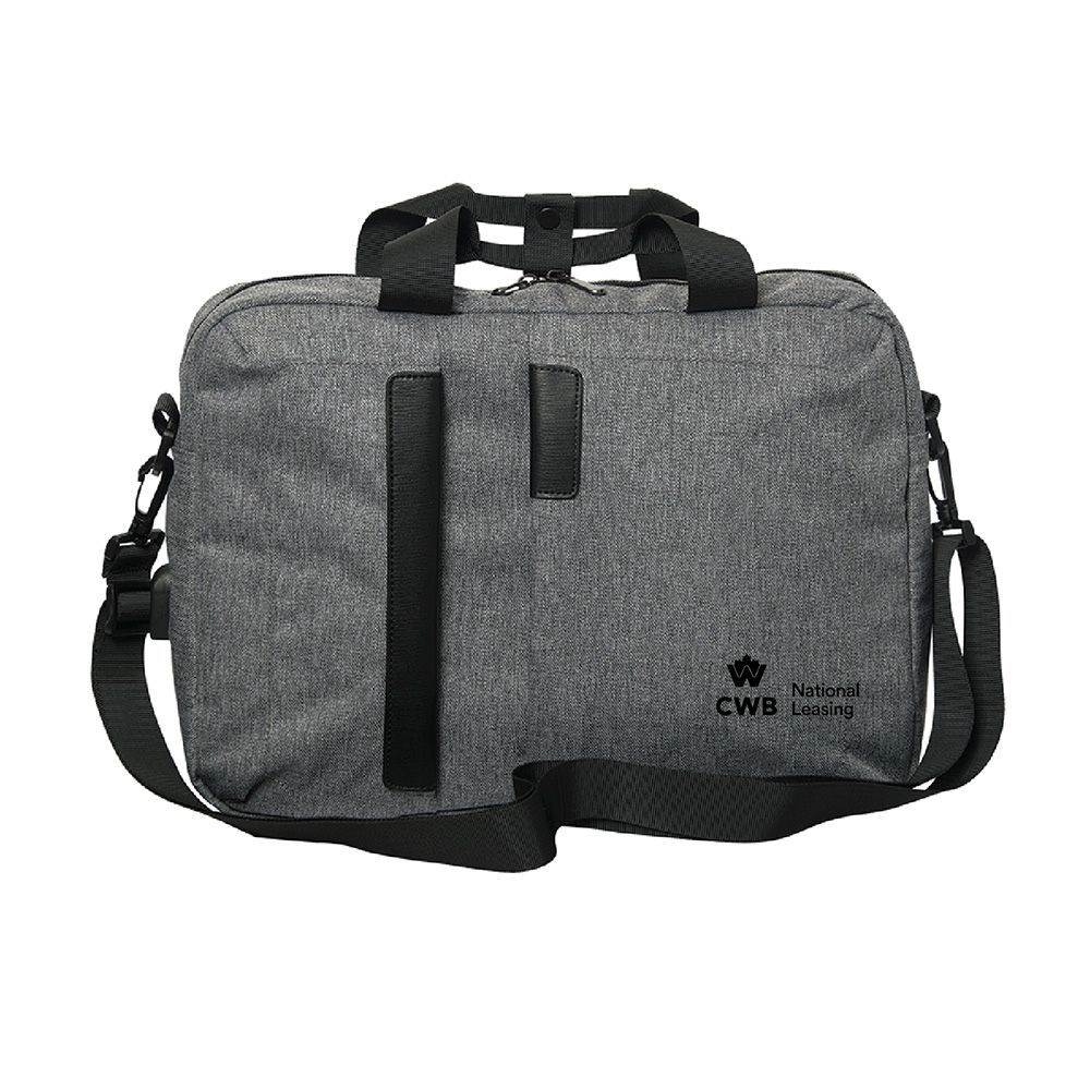 • Polyester • 150D lining • Top zippered closure • Padded area to hold your laptop up to 17.3” • Various organizer pockets inside main compartment • Two webbed carry handles with snap button closure • Removable adjustable/detachable shoulder strap • Two vertical zippered pockets on the front • Back slash pocket with hook and loop fastener • Black webbed band to slip on your roller bag • Your power bank can safely be stored inside the bag (sold separately) and used to charge your device • Built-in external USB power outlet with charging cable • Packed in a non woven storage bag |