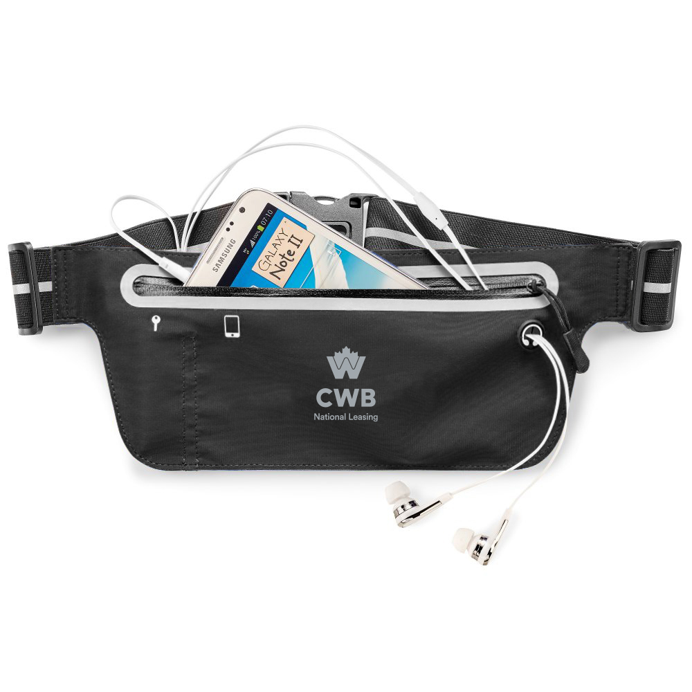 Keep your hands free and your personal belongings secure when you wear the slim and lightweight Misha, a polyester and spandex waist bag. Safety for both you and your devices is a priority. With a water-proof zip front pocket to protect your valuables and reflective printed accents on the front and on the adjustable waist band, you will be nighttime vigilant. Use the headset/earbud slot to listen to your music while your smartphone is securely inside the waist bag.